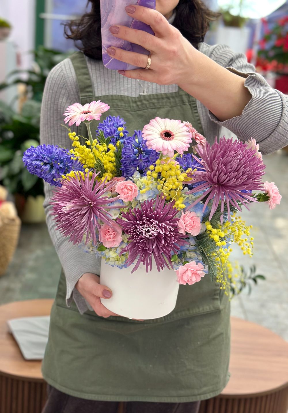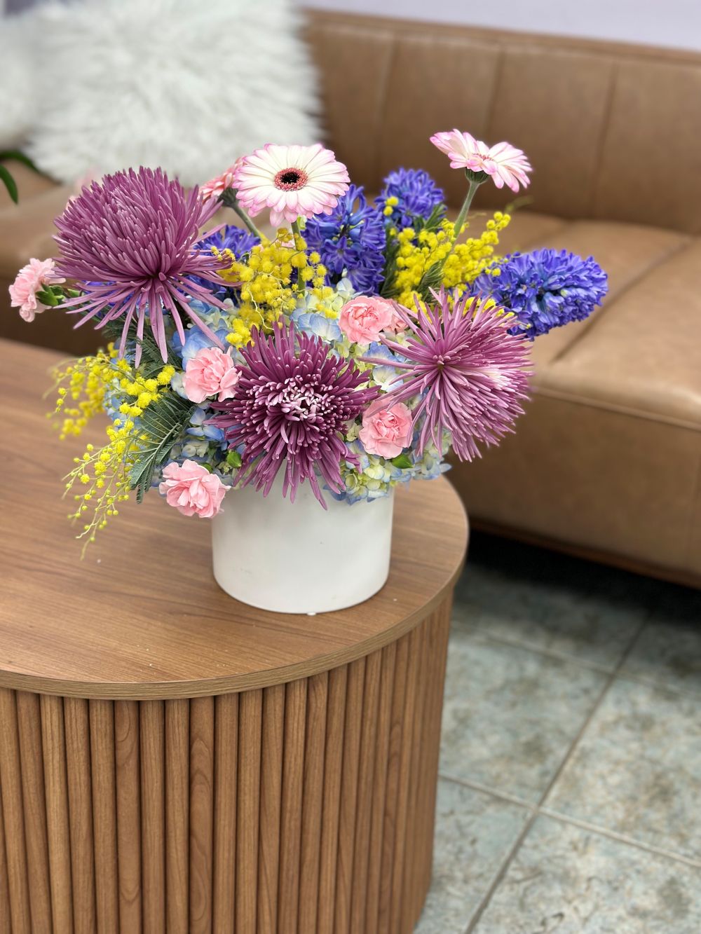 A stunning floral arrangement featuring vibrant purple chrysanthemums, soft pink mini carnations, bright white and pink gerbera daisies, blue hyacinths, and cheerful yellow mimosa. Perfect for any occasion!